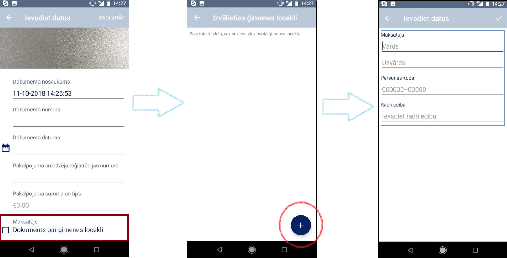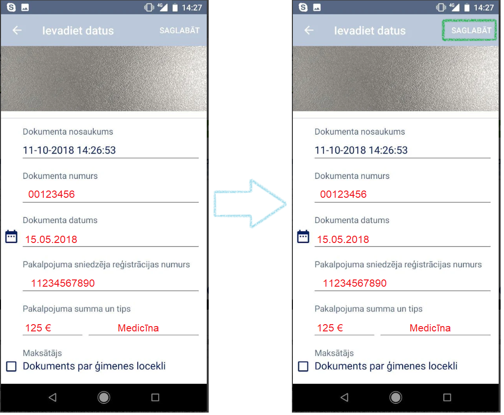 • Nofotografē iegūto attaisnoto izdevumu dokumentu vai izvēlies no savas ierīces galerijas savu iepriekš nofotografētu attaisnoto izdevumu dokumentu;