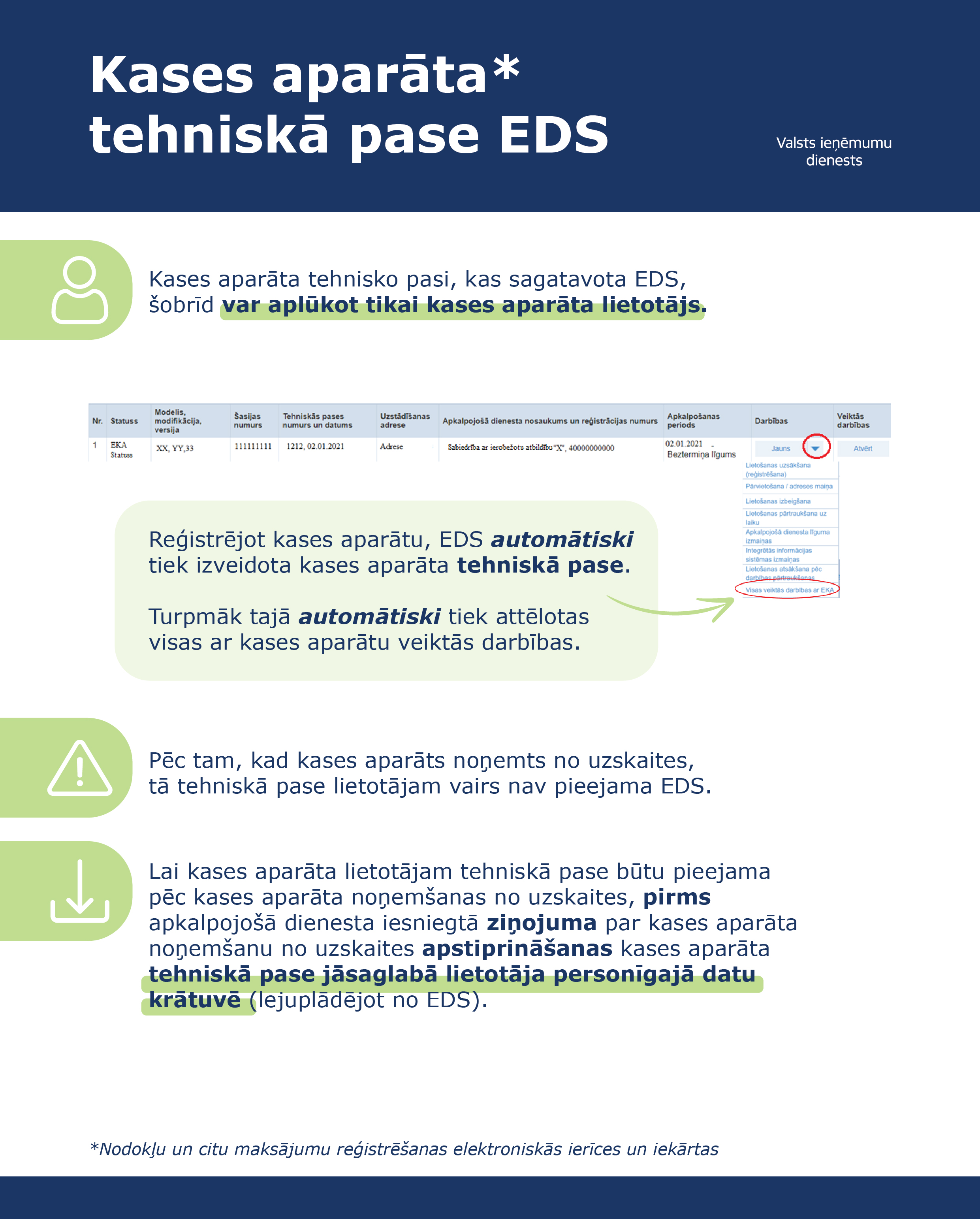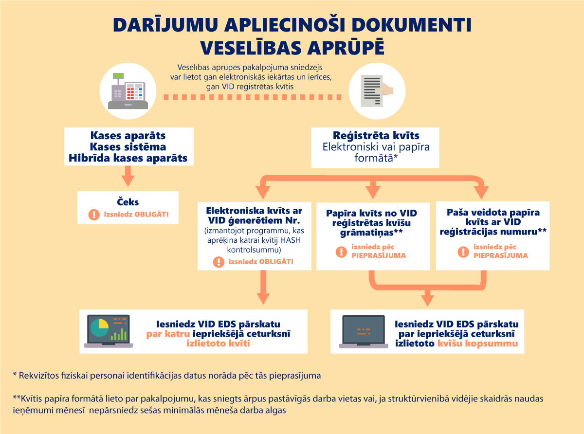 Saņemtā samaksa par darījumiem skaidrā naudā, ar maksājumu kartēm vai citiem maksājuma apliecinājumiem ir jāreģistrē kases aparātā. Tikai atsevišķos izņēmuma gadījumos nodokļu maksātājs darījumu reģistrācijai drīkst nelietot kases aparātu (Ministru kabineta 2014.gada 11.februāra noteikumu Nr.96 “Nodokļu un citu maksājumu reģistrēšanas elektronisko ierīču un iekārtu lietošanas kārtība” 84.punkts).