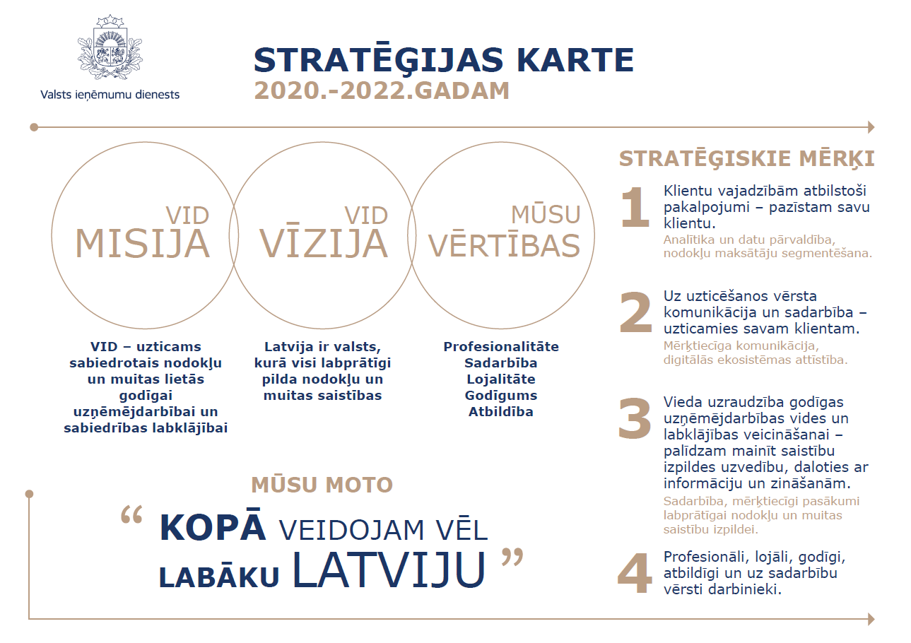 (apstiprināta ar FM 2020.gada 24.aprīļa rīkojumu Nr.138, precizēta ar FM 2021.gada 21.oktobra rīkojumu Nr.622) ir vidēja termiņa vadības dokuments, kas nodrošina VID darbības plānošanu, nosakot VID misiju, vērtības, stratēģiskos mērķus, galvenos rīcības virzienus, rezultatīvos rādītājus un to sasniedzamās skaitliskās vērtības, saskaņā ar kurām tiks noteikta mērķu sasniegšanas pakāpe.