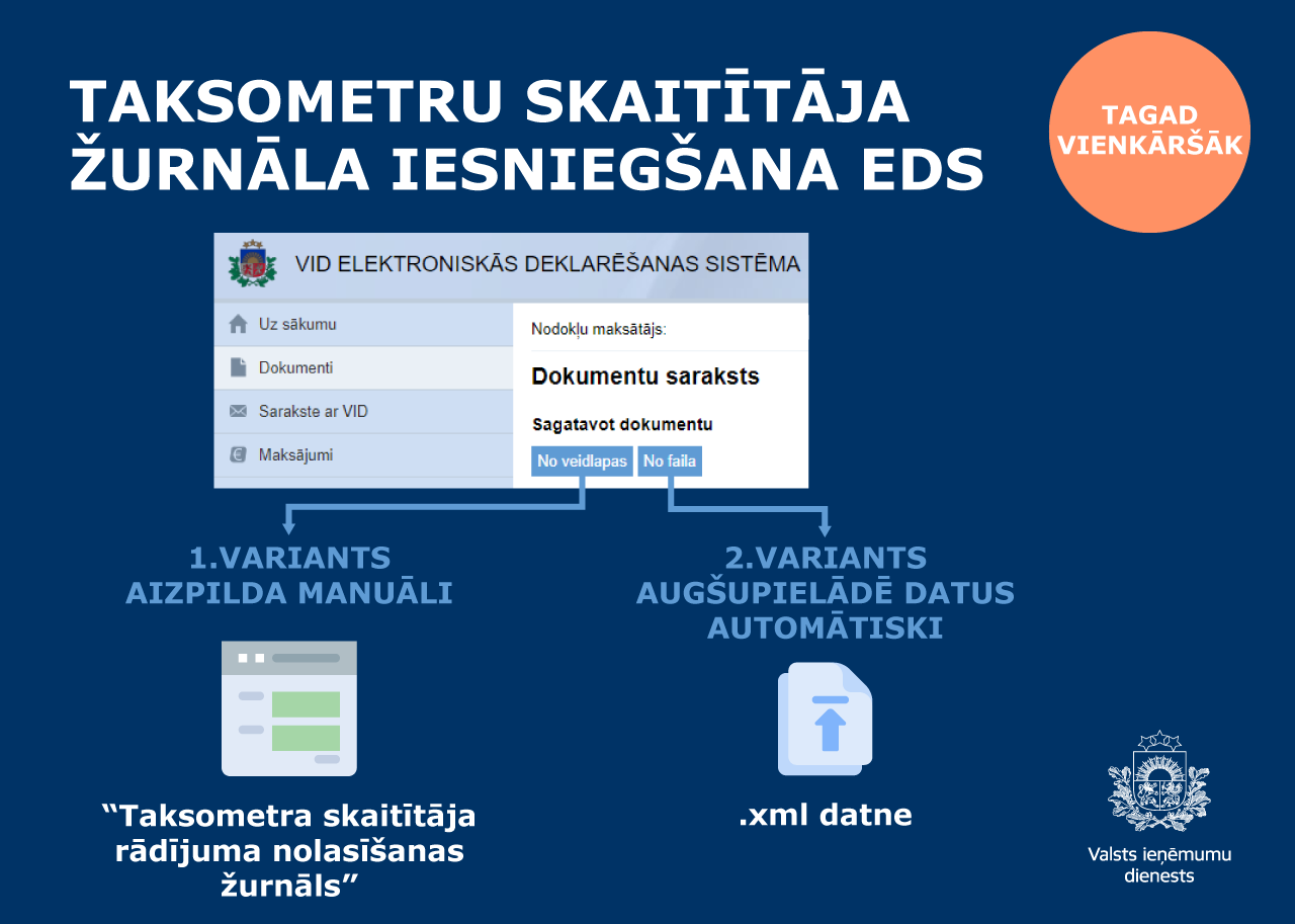 Sākot ar 2020.gada 1.janvāri, taksometra skaitītāja lietotājam katras darbadienas beigās pēc skaitītāja rādījuma nolasīšanas jāiesniedz taksometra skaitītāja žurnāls VID Elektroniskās deklarēšanas sistēmā.