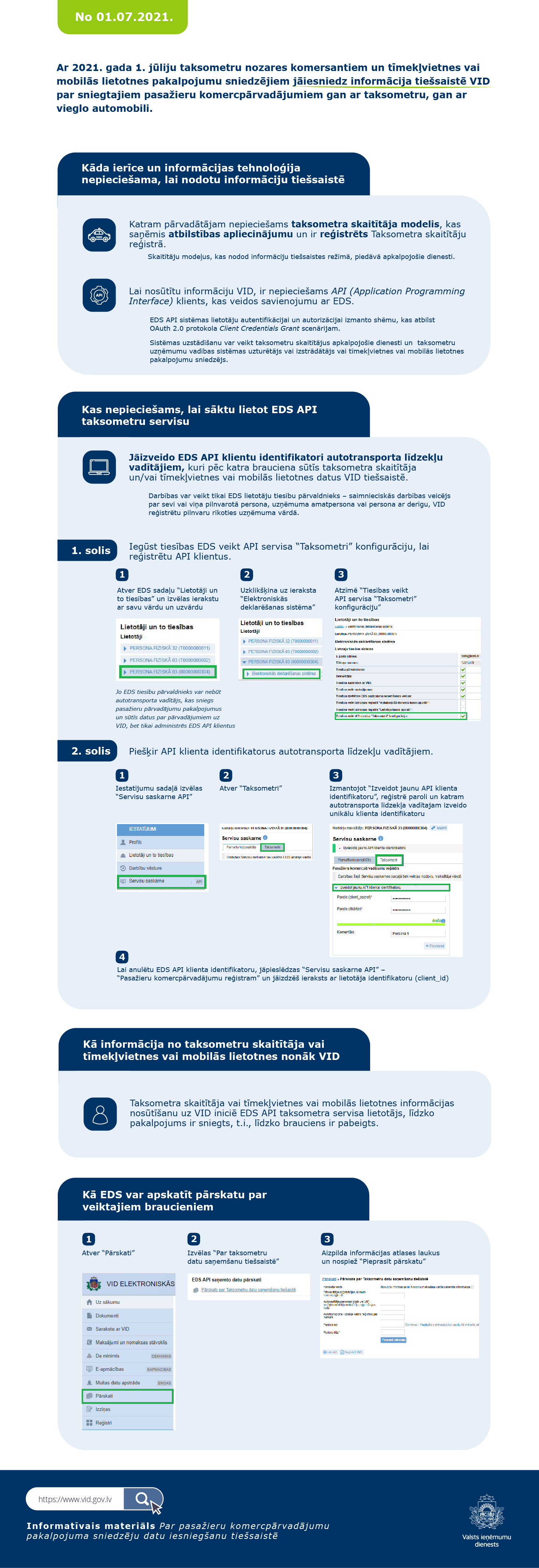 2021.gada 1.jūlijā stājas spēkā prasība iesniegt tiešsaistē datus Valsts ieņēmumu dienestam (VID) gan par sniegtajiem pasažieru komercpārvadājumiem ar vieglo automobili, gan ar taksometru, t.sk., ja pakalpojums tiek sniegts, izmantojot tīmekļvietni vai mobilo lietotni.