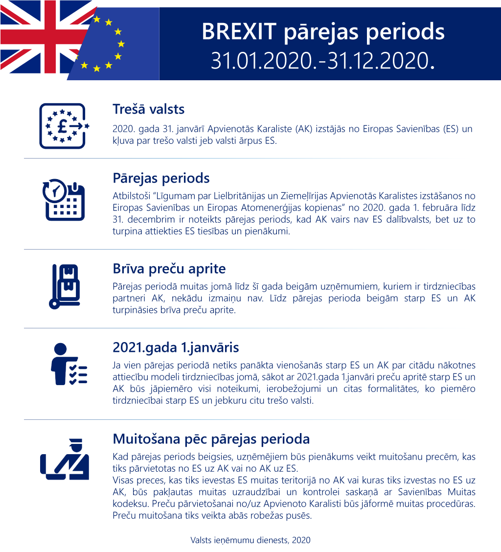 2020. gada 31. janvārī Apvienotās Karaliste (turpmāk – AK) izstājās no Eiropas Savienības (turpmāk - ES) un kļuva par trešo valsti jeb valsti ārpus ES. Līdz 2020.gada 31. decembrim bija noteikts pārejas periods, kura laikā starp ES un AK turpinājās brīva preču aprite.
